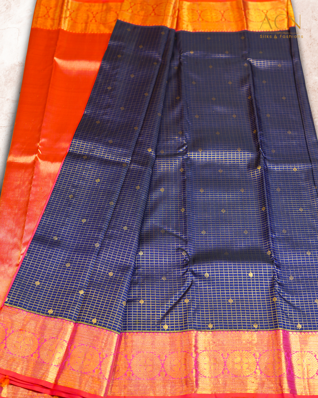 Checks kancheevaram saree with contrast color combination, beautiful small buttas in middle of the saree adds more traditional touch