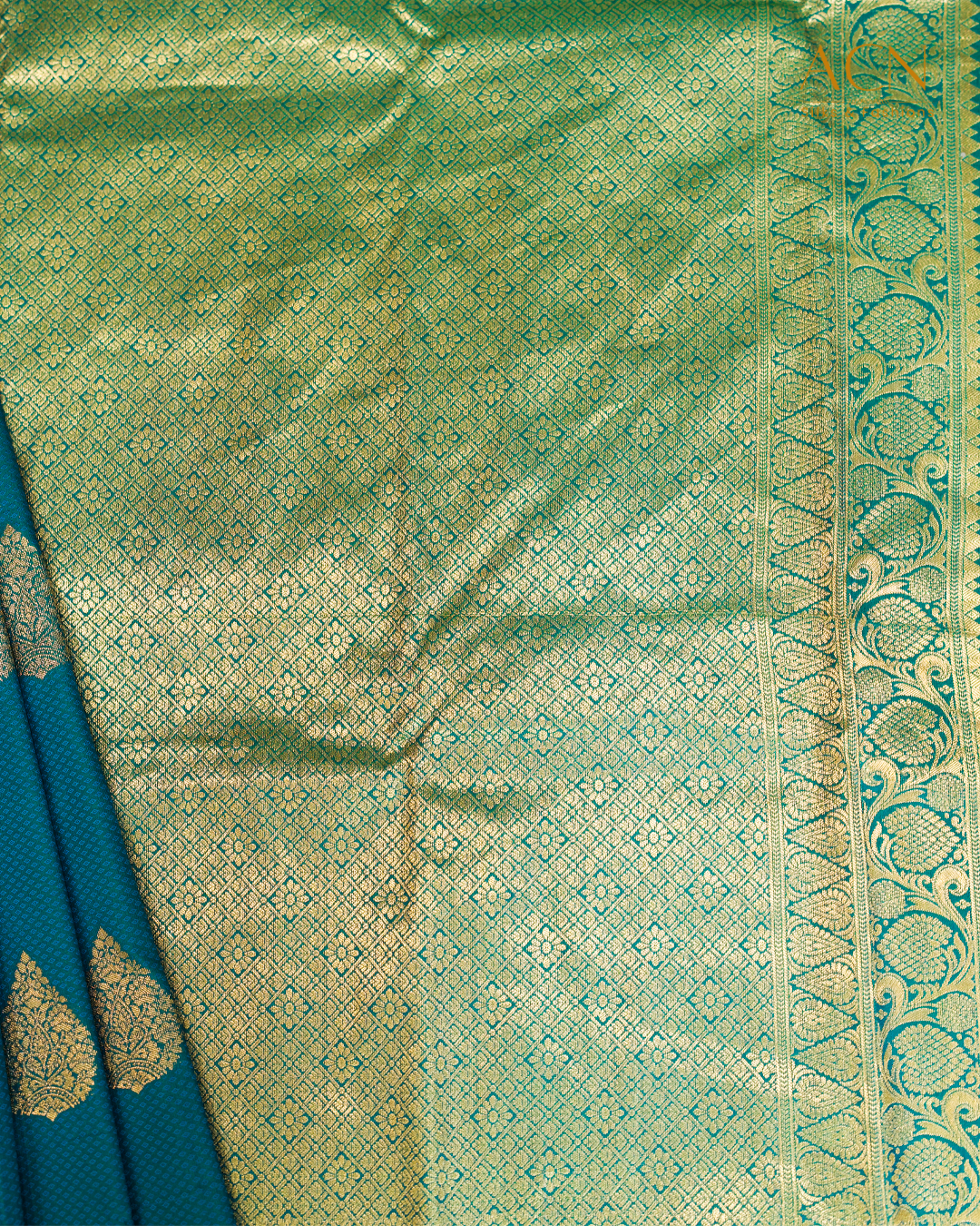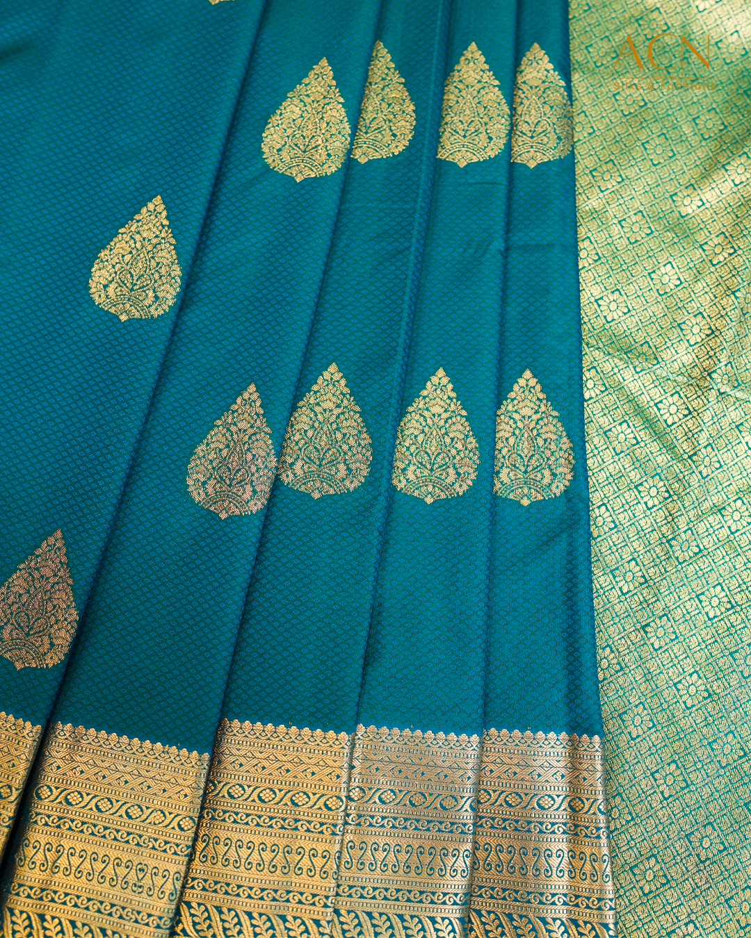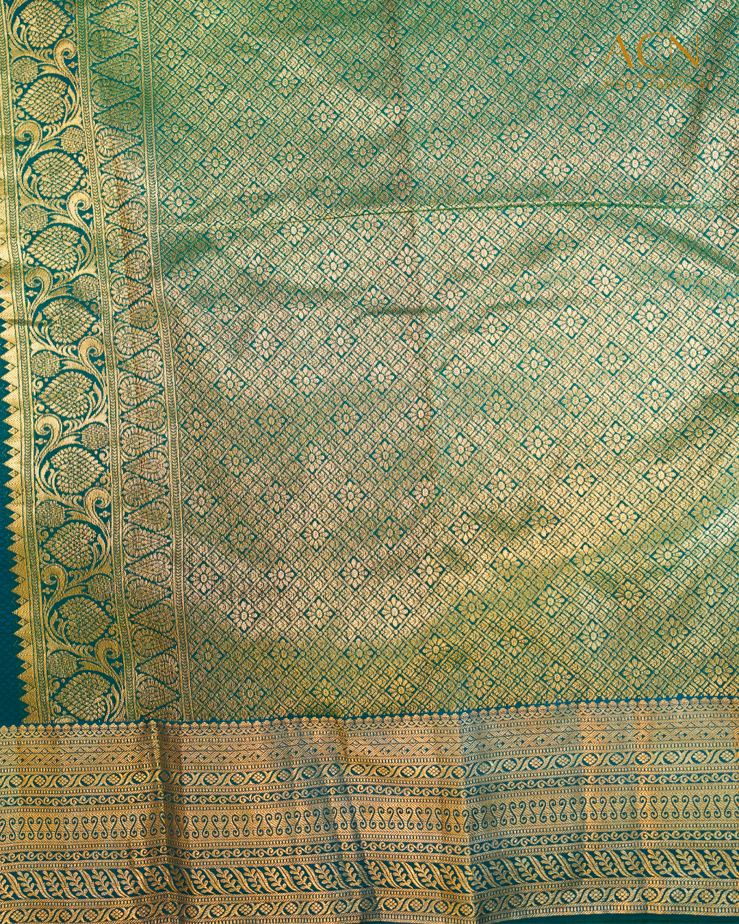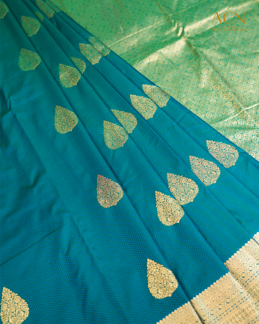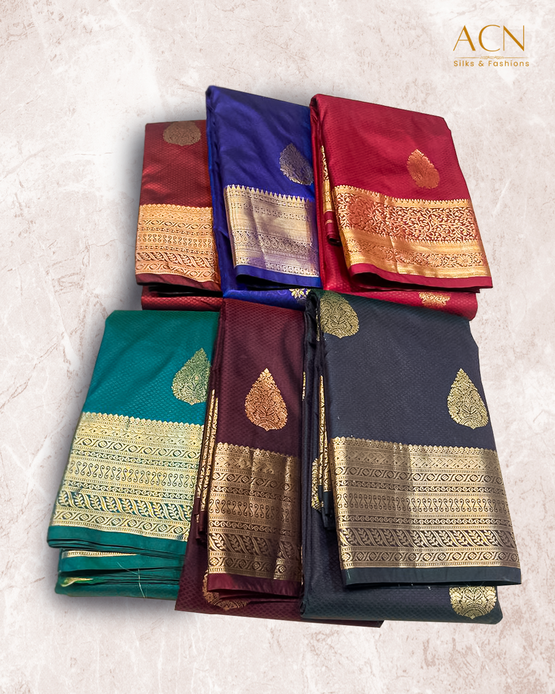 This beautiful mix Kancheevaram saree features rich traditional colors with elegant naam buttas all over, a stunning zari pallu, and classic gatti borders, a perfect blend of heritage and grace