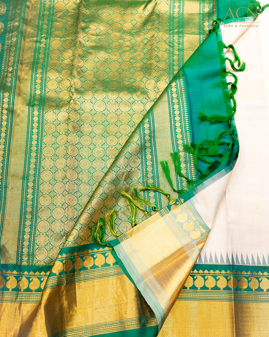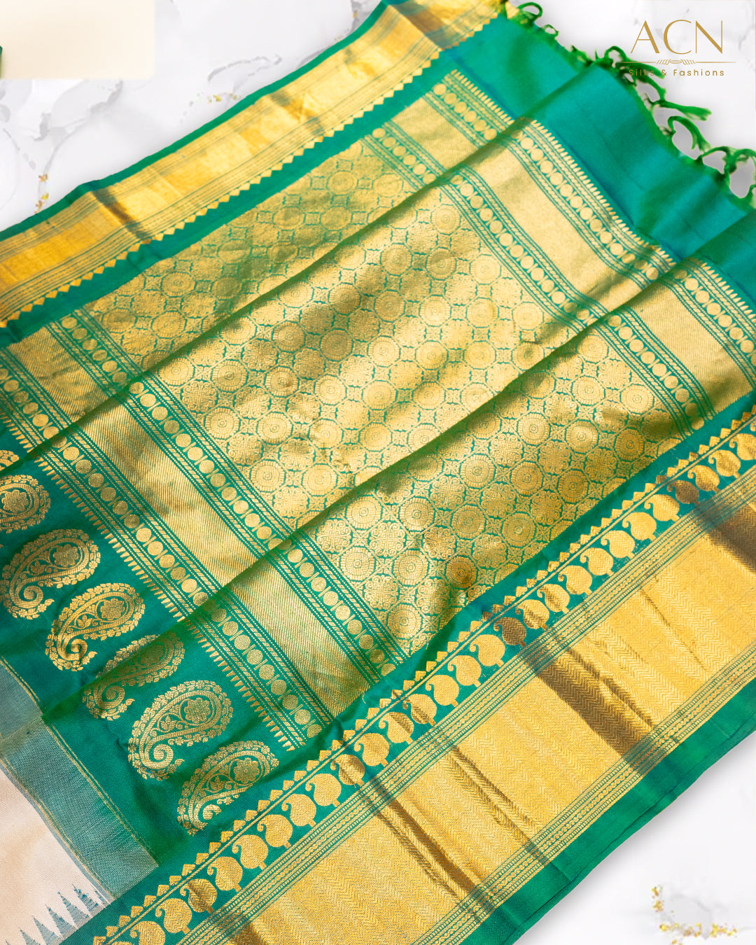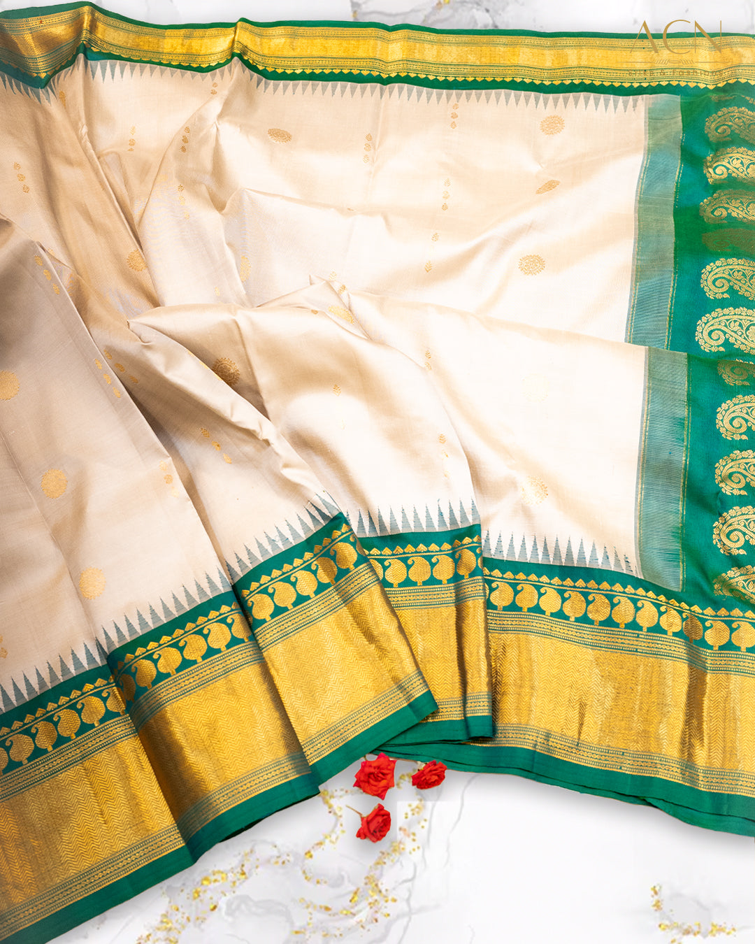 Half white with green temple border , traditional Kanchi Gadwal saree with zari buttas gives it a vintage look