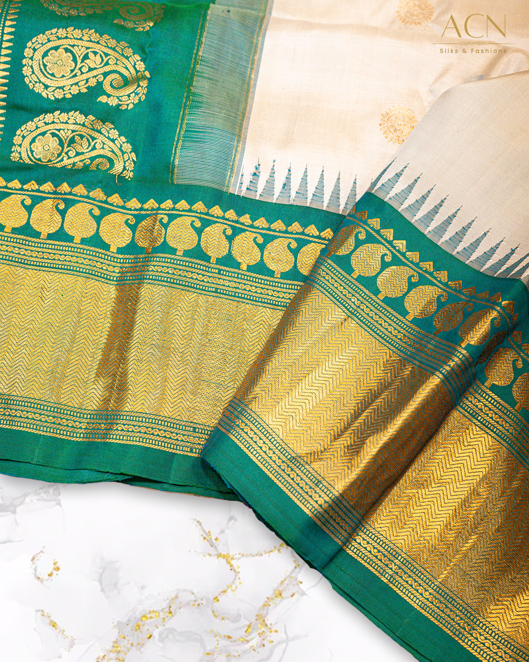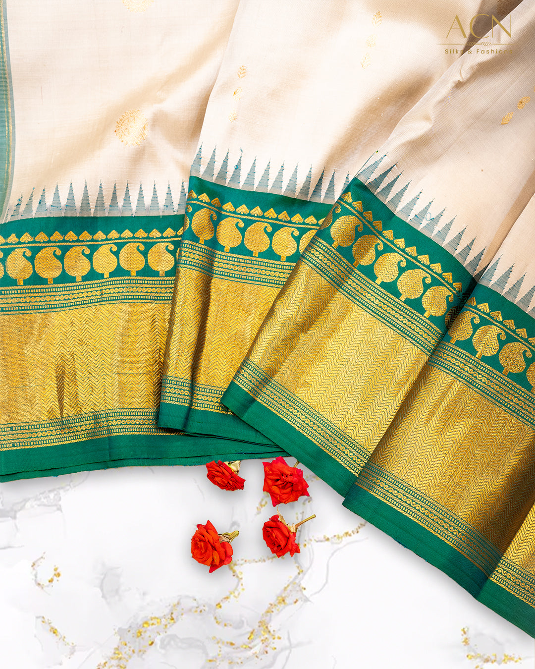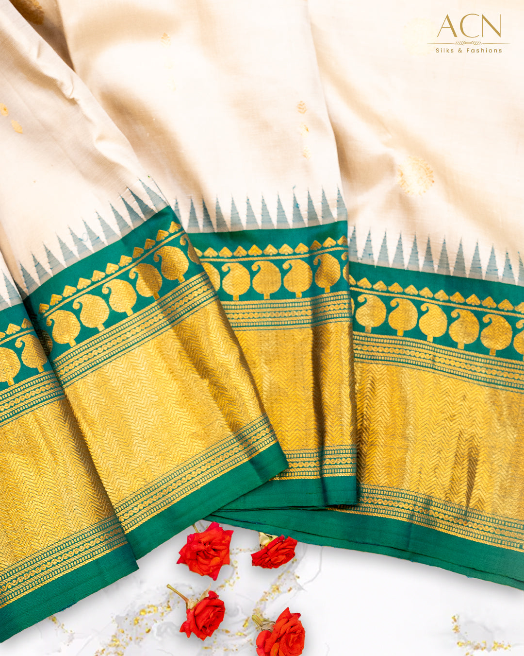 Half white with green temple border , traditional Kanchi Gadwal saree with zari buttas gives it a vintage look