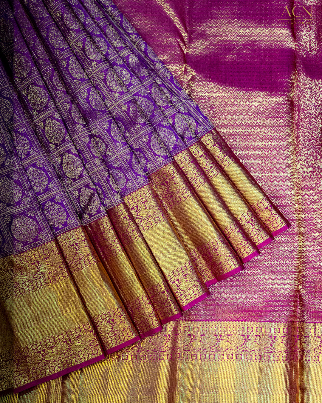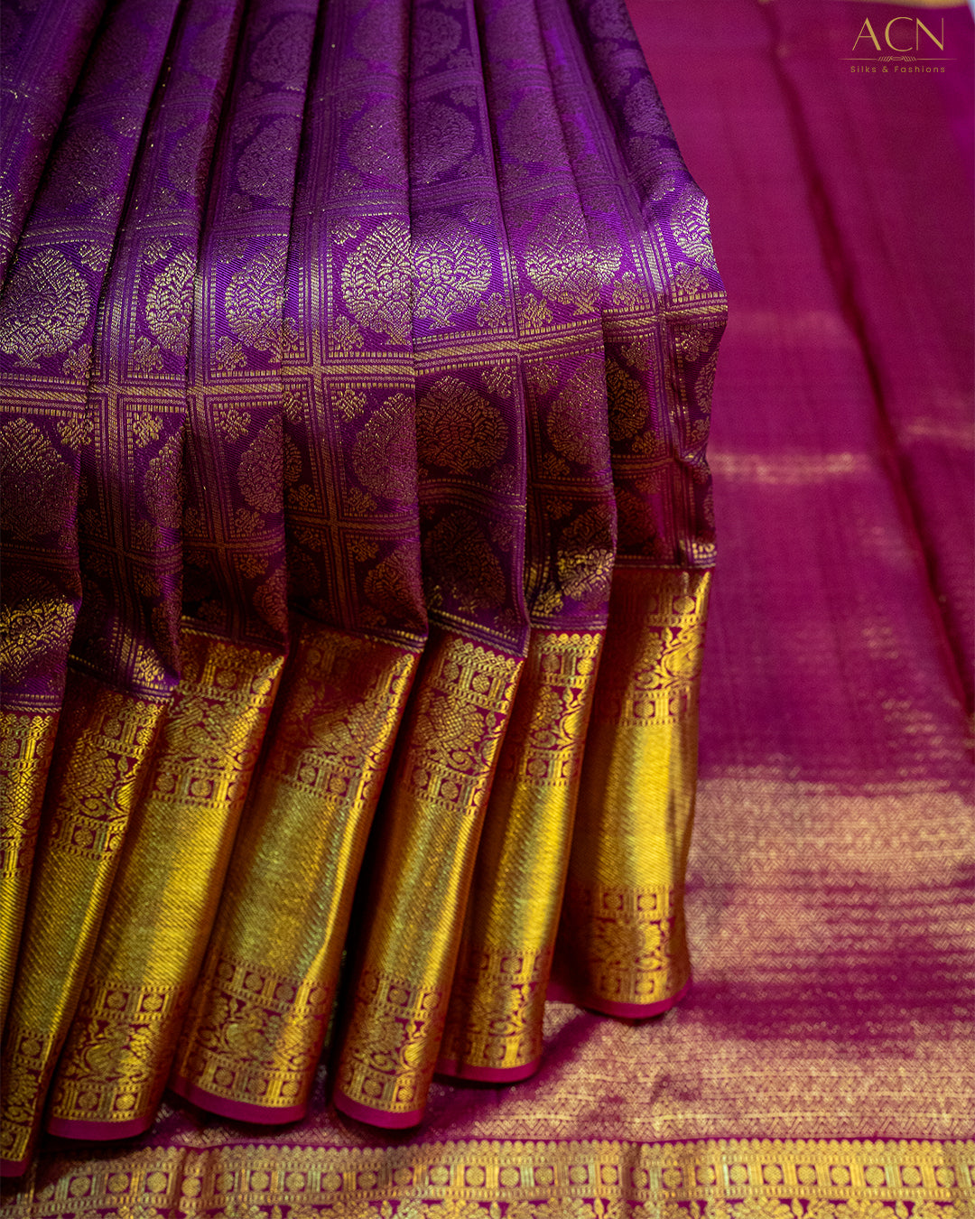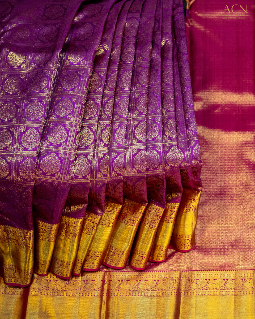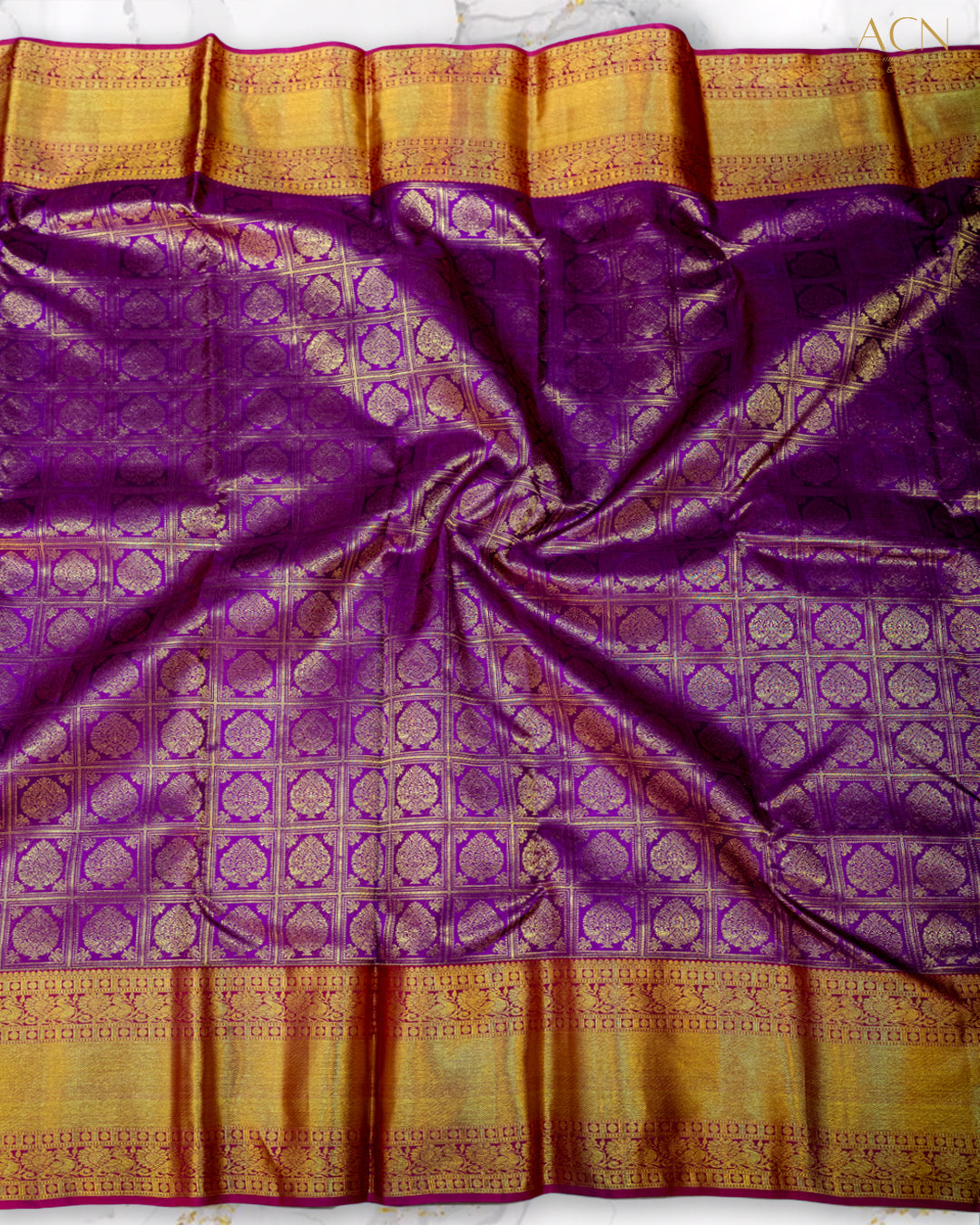 A bridal kancheevaram saree with complete brocade design all over the saree woven in golden zari , purple body and dark pink border gives it a rich and elegant look