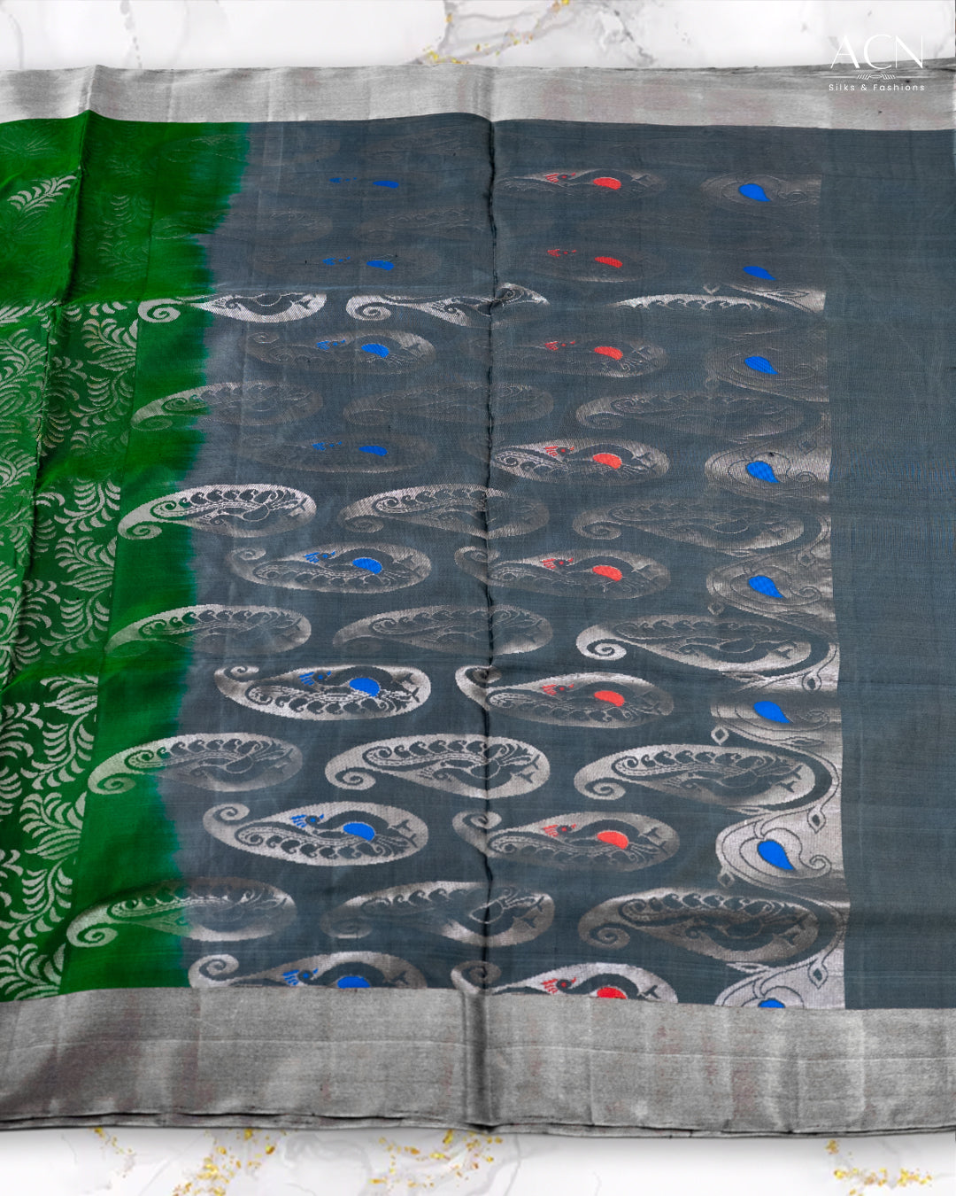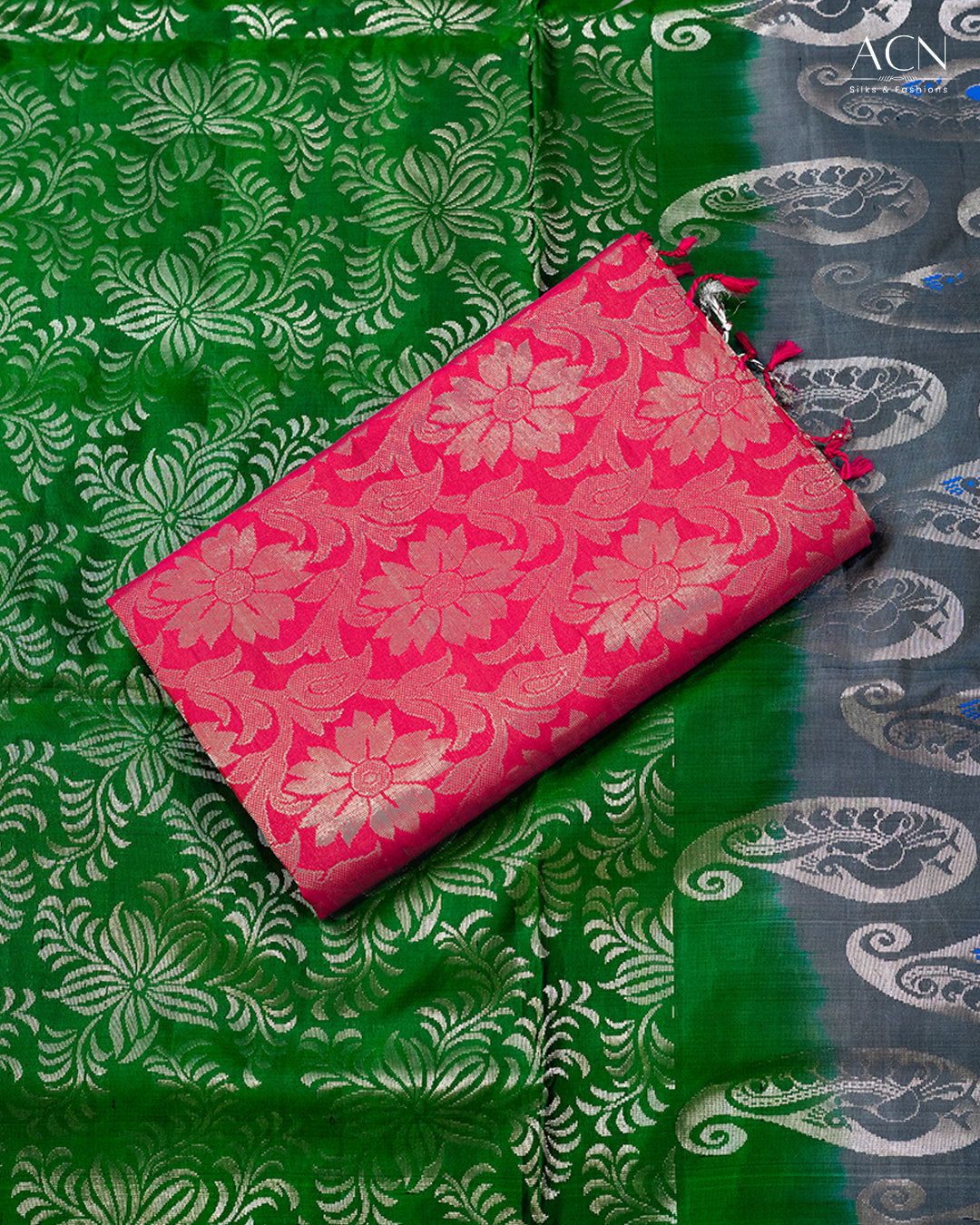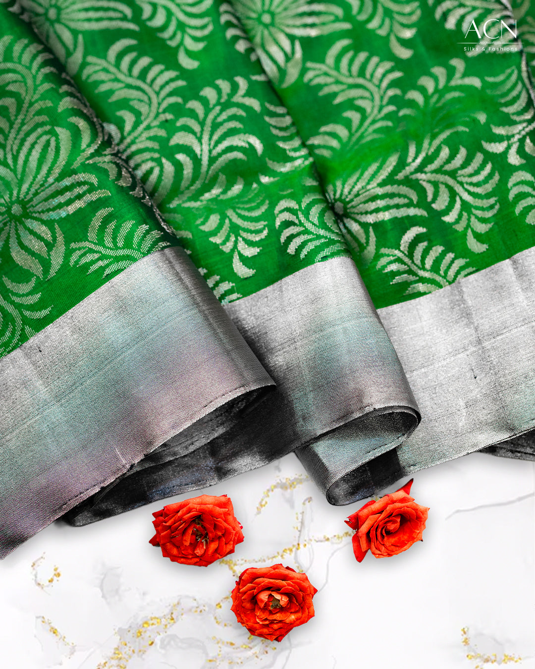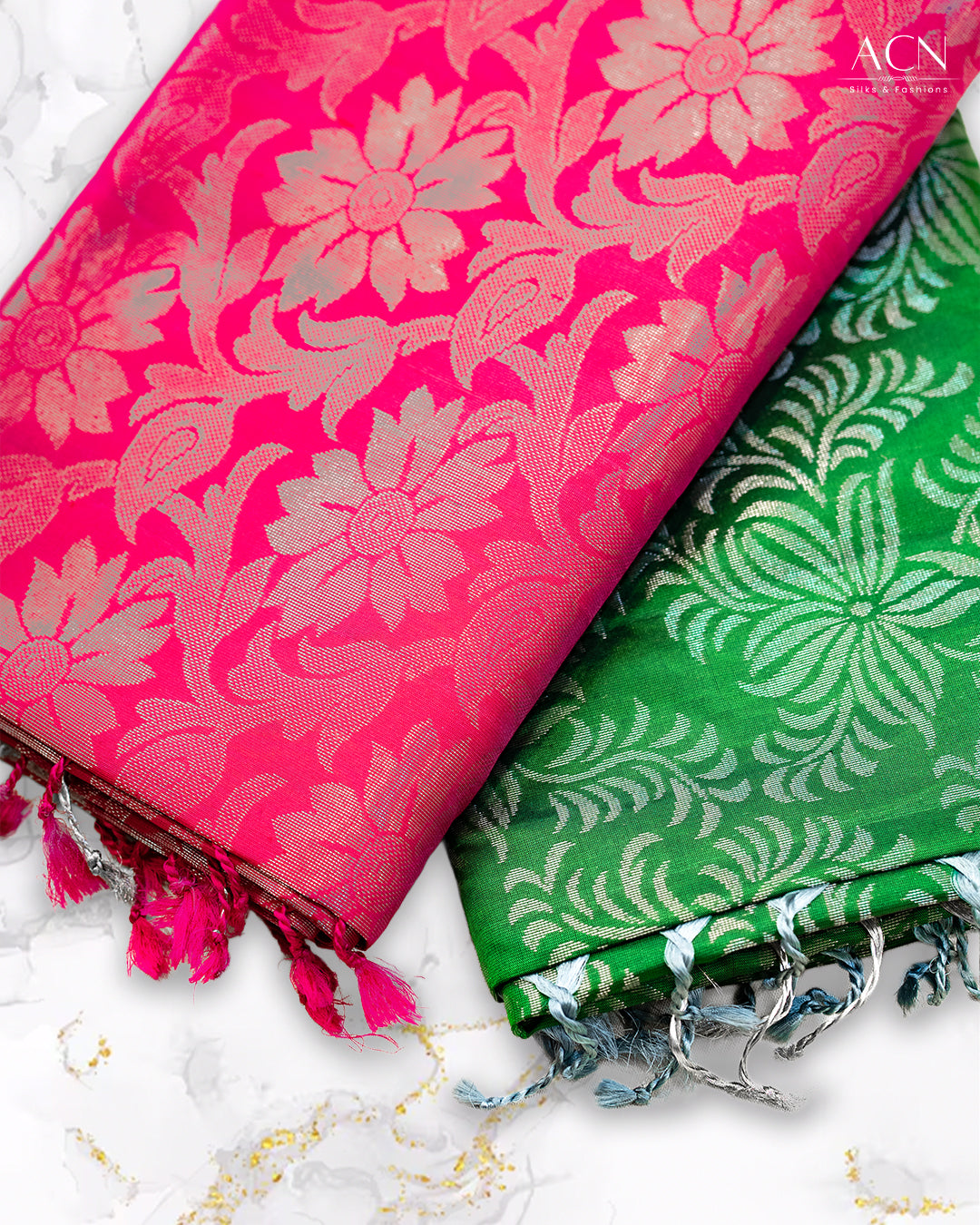 Pure soft silk brocade sarees with silver zari all over and contrast grey pallu , light and soft to wear . Available in two colors